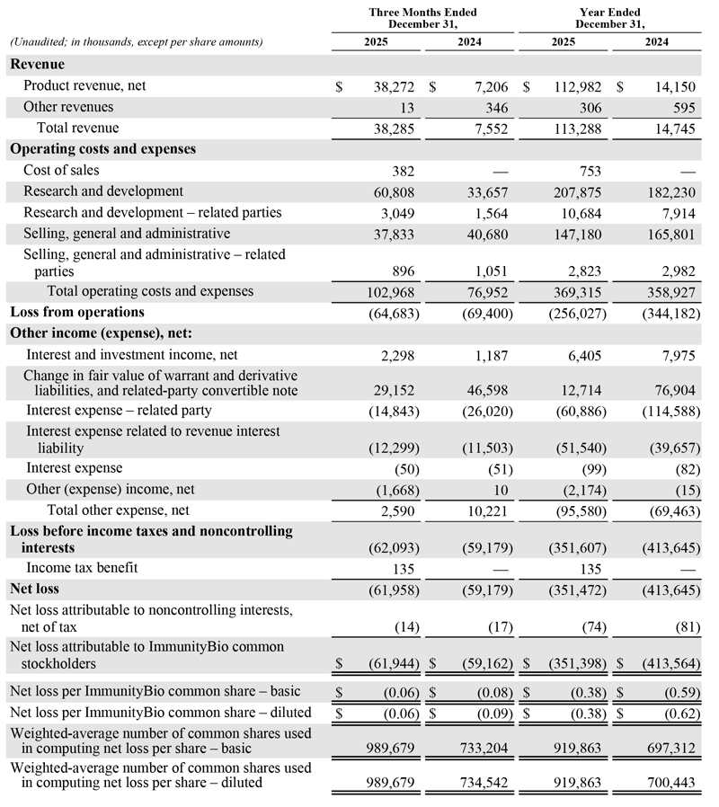 Net loss attributable to ImmunityBio common stockholders was $61.9 million during the three months ended December 31, 2025, as compared to $59.2 million during the three months ended December 31, 2024. The increase in loss was primarily driven by higher R&D expense described above, changes in the fair value of a related-party convertible note, and fixed asset write-offs, partially offset by higher product revenue, lower SG&A expense, lower related-party interest expense, and changes in the fair value of warrant liabilities.