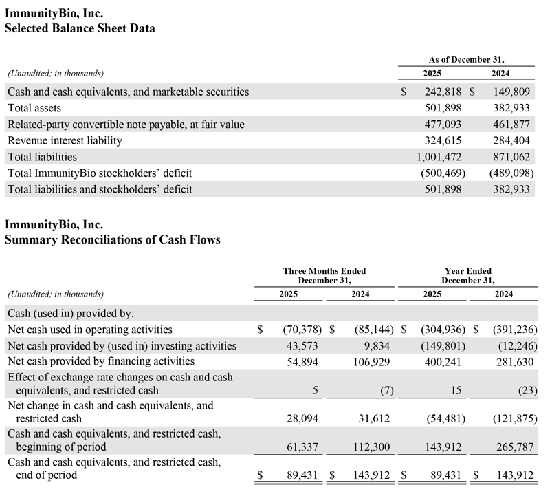“Our 2025 financial results reflect the growing clinical adoption of ANKTIVA as a foundational backbone of immunotherapy for bladder cancer,” said Richard Adcock, President and CEO of ImmunityBio. “Our partnership with Accord Healthcare deploys over 100 commercial professionals across 30 European countries, and our collaboration with BioPharma & Cigalah positions us for rapid commercial execution in Saudi Arabia and the broader MENA region. With subsidiaries now established in Dublin and the Kingdom of Saudi Arabia, we have the infrastructure to support sustained commercial growth across all 33 countries where ANKTIVA is authorized. As we advance toward initial international commercial activities, we remain focused on disciplined execution: completing enrollment in our BCG-naïve randomized trial with a BLA filing targeted by Q4 2026, expanding the ANKTIVA label into lung cancer and lymphopenia, and converting our 700% revenue growth trajectory into durable, long-term value for shareholders.”